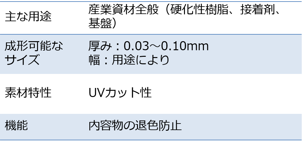 主な用途・成形可能サイズ・特性としては右に記載の通りです。本製品は、フィルムに原料を混ぜ、紫外線防止機能を付加している点に特長があります。
