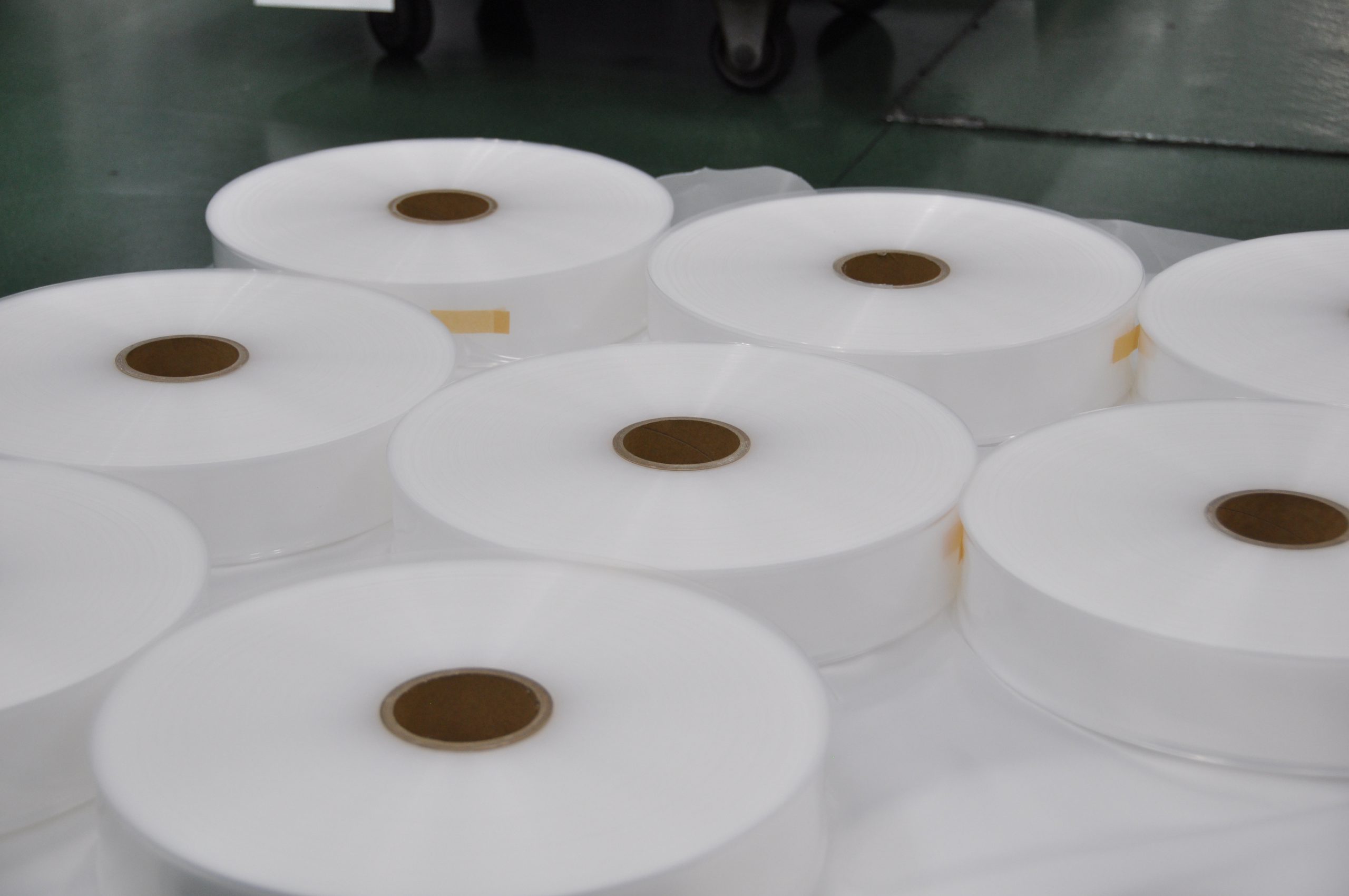 こちらは、フィルム検索BOXで製造した、防湿性養生シートの原反となります。用途としては建設現場において地面の防湿養生・床面、鉄筋養生として使用されるもので、防湿を持たせている点に製品としての特長があります。この原反は小巻加工と呼ばれる、手で持ちやすいサイズに巻きなおした原反であり、建設現場などにおける作業性を十分に考慮したものとなっています。